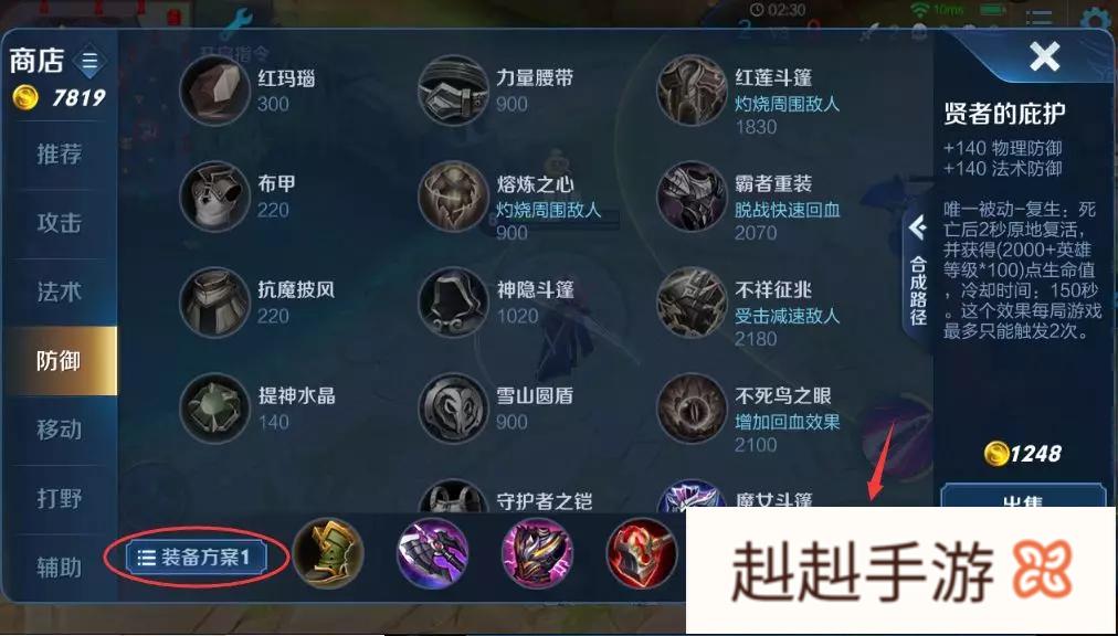 当玩家把常规装备都出完后,这时就可以先点一下复活甲,并且将装备方案切为方案2,这样才方便一会快速出售。当然,很多人可能不知道怎么切换方案,这里笔者也是把切换方案的位置圈出来