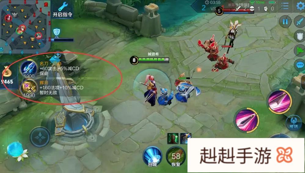 由于在第二步中,玩家已经点击了复活甲,这时只需要在被敌人打出复活甲时,立刻点背包,然后按下出售,接着在回到游戏界面中点击商店旁的名刀,这样的操作也就实现了快速换装备,提高英雄的续航能力。