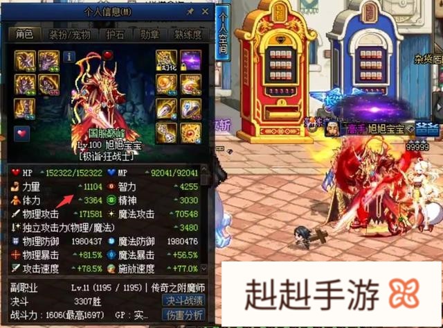 但是在经历了12年变化之后的100级版本,装备和面板自然是翻了几番,在目前的100级版本旭旭宝宝左边放穿戴的是改恶5,右边武器穿戴太极天帝剑,首饰大恍惚,特殊军神,增幅方面更是全服最高的16~17,力量高达11104,物攻高达17.1W,而相较于60版本力量就涨了19.5倍,物攻更是涨到了54倍,面板膨胀了非常的夸张,但是不至于达到数百倍的地步。