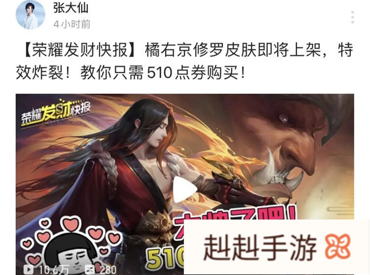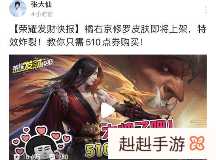 王者荣耀是一款非常火爆的手游,运营4年多来深受年轻玩家的喜爱。在明天的时候王者荣耀会进行一波更新,此次更新最大的亮点就是上线了橘右京的修罗皮肤,就在昨天的时候很多游戏主播在直播的时候都向大家展示了这款皮肤。在局内的实际特效真的是非常的棒,张大仙发现了一个白菜价买橘子新皮肤的秘诀,学会一个骚操作修罗这款皮肤可以便宜200点券!具体怎么操作呢?跟随蝉儿一起来看一看。