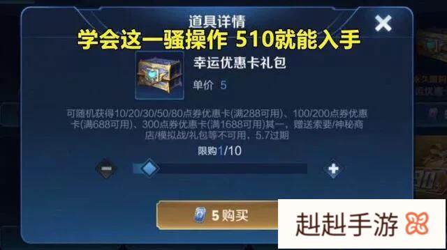 不得不说,这个幸运优惠卡礼包还是相当值得一试的。首先是这个礼包的价格非常便宜,只有5点券,折合成人民币也只要5毛钱,而每个玩家也只能限购十个。如果运气好的话,从中开出,满688-200那岂不是美滋滋?就算运气不好也没太大关系,当中还有满288-50或-80的优惠卡。开出这些优惠卡去买一些288的皮肤,也是相当不错的哦。