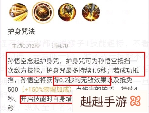 孙悟空的一技能护身咒法,使用之后在1.5秒之内可以抵挡一次敌方英雄的技能,在成功抵挡之后,还会获得0.2秒的无敌效果,还有就是可以抵免500加150%物理加成的护盾,持续四秒钟,一技能开启之后还会增加40%的移动速度,持续一秒钟。