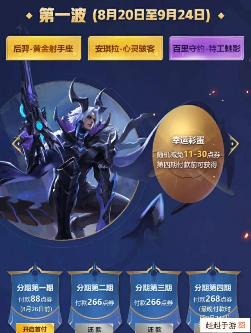 这个活动总共分为了两个波次,每一个波次里面的皮肤是不一样的,首先,第一波是从8月20号到9月24,总共一个月多一点的时间,分期付款的皮肤为后羿的黄金射手座,安琪拉的心灵骇客,百里守约的特工魅影,可以首付一点,然后分三次完成全部的支付,并且每次支付的时候还能随机减免11到30的点券。