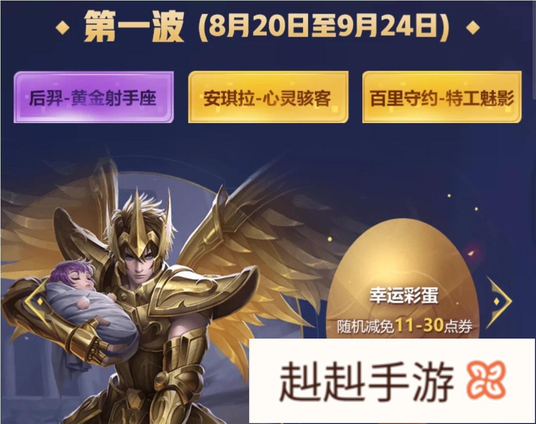 首先这个活动是在道具城内,不是在王者荣耀游戏,上一张图片有本次活动的详细内容。这个活动的活动时间是从8月20日一直截止到10月1日,活动第一波时间是从8月20日到9月24日,在这个活动期间还会有幸运彩蛋,会随机减免11到30点券。第一款皮肤是后裔的黄金射手座,一共分四期。首付是168点券第二期是506点券,第三期也是506点券,第四期是付完最后的所有点券即可获得这款皮肤。