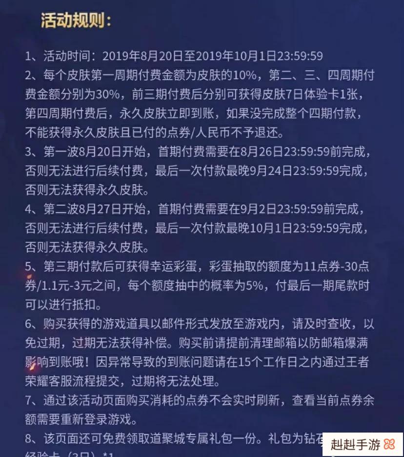 这里要重点说一下,如果在四期中,有任何一期你没有付款,那么你都不会获得永久皮肤,并且之前消费的点券也不会退还。如果你是想在这个活动中,购买皮肤的话,那么一定要按时付款,千万不要遗忘。