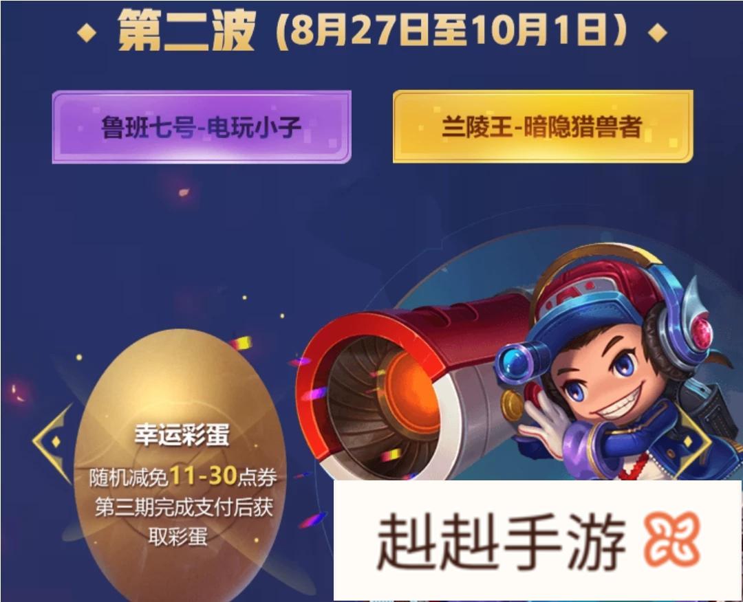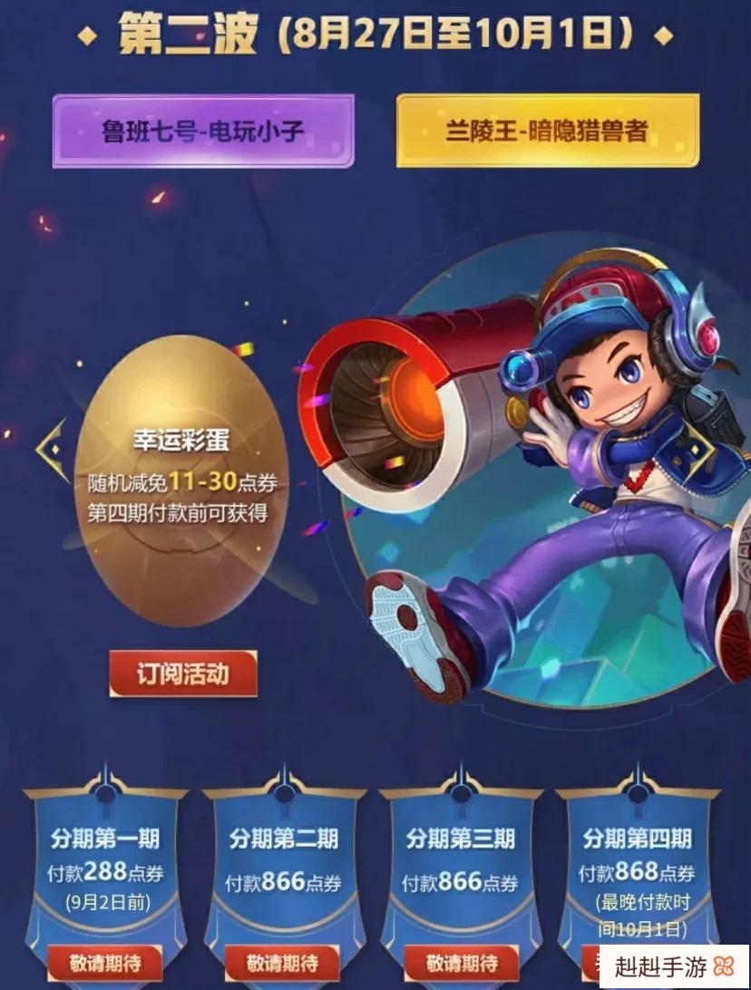 第二波分期付款活动是从8月27日到10月1日一共有两款皮肤,分别是鲁班七号的电玩小子和兰陵王的暗影猎兽者。与第一波活动一样,也有一个幸运彩蛋也是随机减免11到30点券。并且鲁班七号的首付需要288点券,第二期与第三期都需要付866点券。最后一期付完,剩下的余款即可获取永久皮肤。兰陵王的皮肤付款方式与暗影狩猎者的付款方式相同。