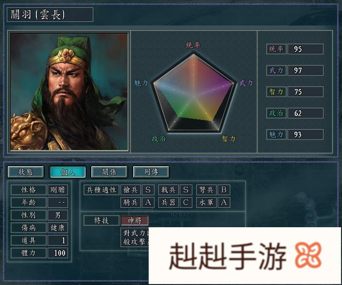 其实像关羽这种统武双高,智力也不太差的武将,还是不少的。不过,其中统武最高的,就要数关二爷了。95的统率,97的武力,单独拿出来一个都是单项名列前茅的,两项合计,已经无出其右者。