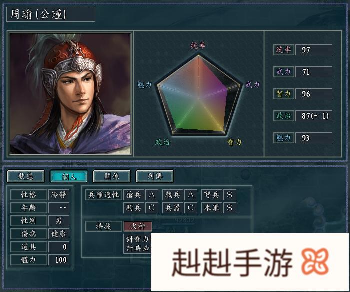 在三国志11中,周瑜的五维属性:统率97,武力71,智力96,政治86,魅力93。周瑜的五维属性非常优秀,在三国中也属于顶尖。高统高智,再加上71的武力,完全可以不用副将而独领一军。兵种方面,弩兵和水军双S适性,也是要远超常人。最为重要的是,周瑜的特技是火神,对智力比自己低的部队施展火计时必会成功,于全火攻有所优势。周瑜的这个特技加上他不低的武力支持,完全可以靠超高的智力碾压一切。2万打10万都不是问题!火神周瑜,赤壁一场大火,留得英名万古存!