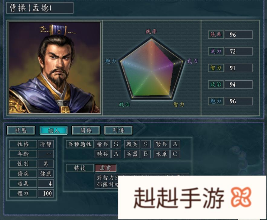 在三国志中五维属性非常重要,这五维分别是武力,智力、政治、魅力、防御,而从五维属性综合来看总和,其中曹操是当之无愧的第一,可以看出,曹操是最全面的一位武将,此外,曹操兵种属性都高于A,除了水军以外,适用于所有分支。曹操的计谋虚实这样就对于那些智力低于他的武将,使用时必定成功,而且他如果和荀攸郭嘉两人组合堪称无敌。