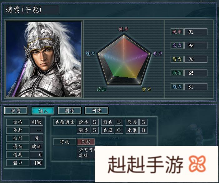其次,赵云的智力虽然只能算三流,但是特技“洞察”却是一个魔免特技,是在初始状态下,唯一不怕诸葛亮的武将,这一点的在单独带队的时候,是非常大的加分项。