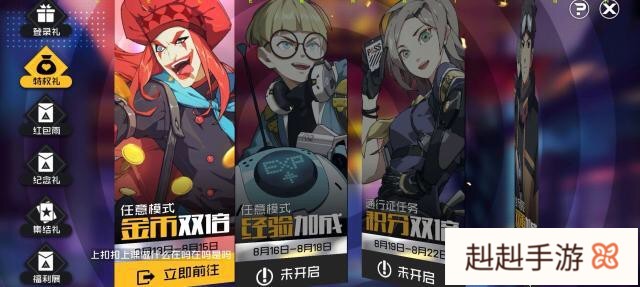 特权礼:分别在4个时间段开启,有金币双倍(8月13日到8月15日)、经验加成(8月16日到8月18日)、积分双倍(8月19日到8月22日)和金币经验双重加成(8月23日到8月26日),而且所有的模式都支持加成,大家选择自己喜欢的模式去玩就可以了。