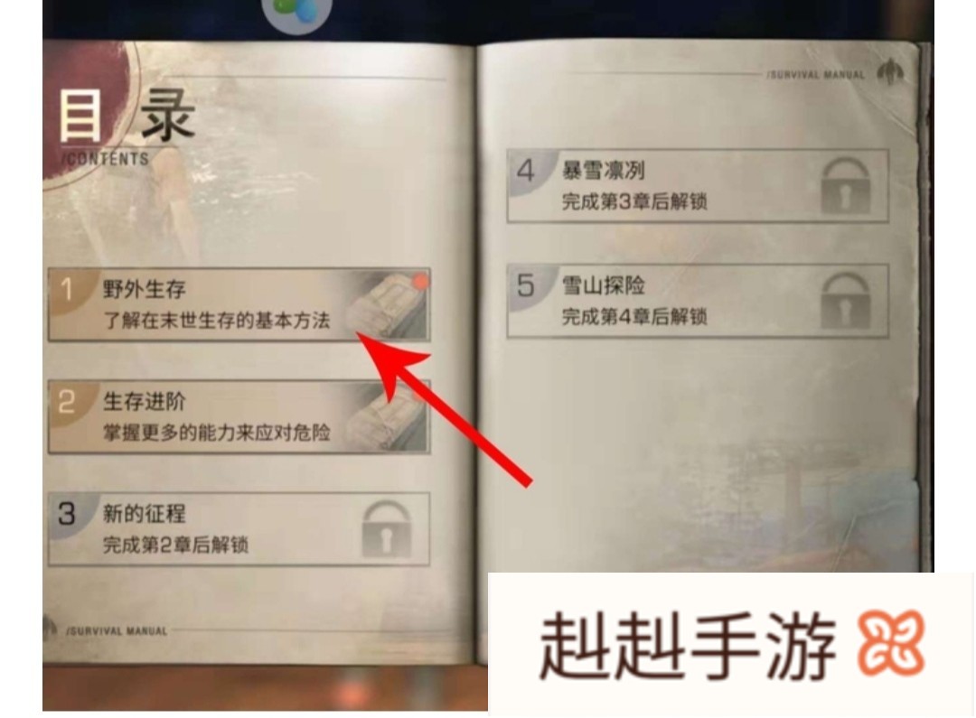 3 打开生存手册目录页后,依次点开野外生存任务、生存进阶任务、新的征程任务、暴雪凛冽任务和雪山探险任务