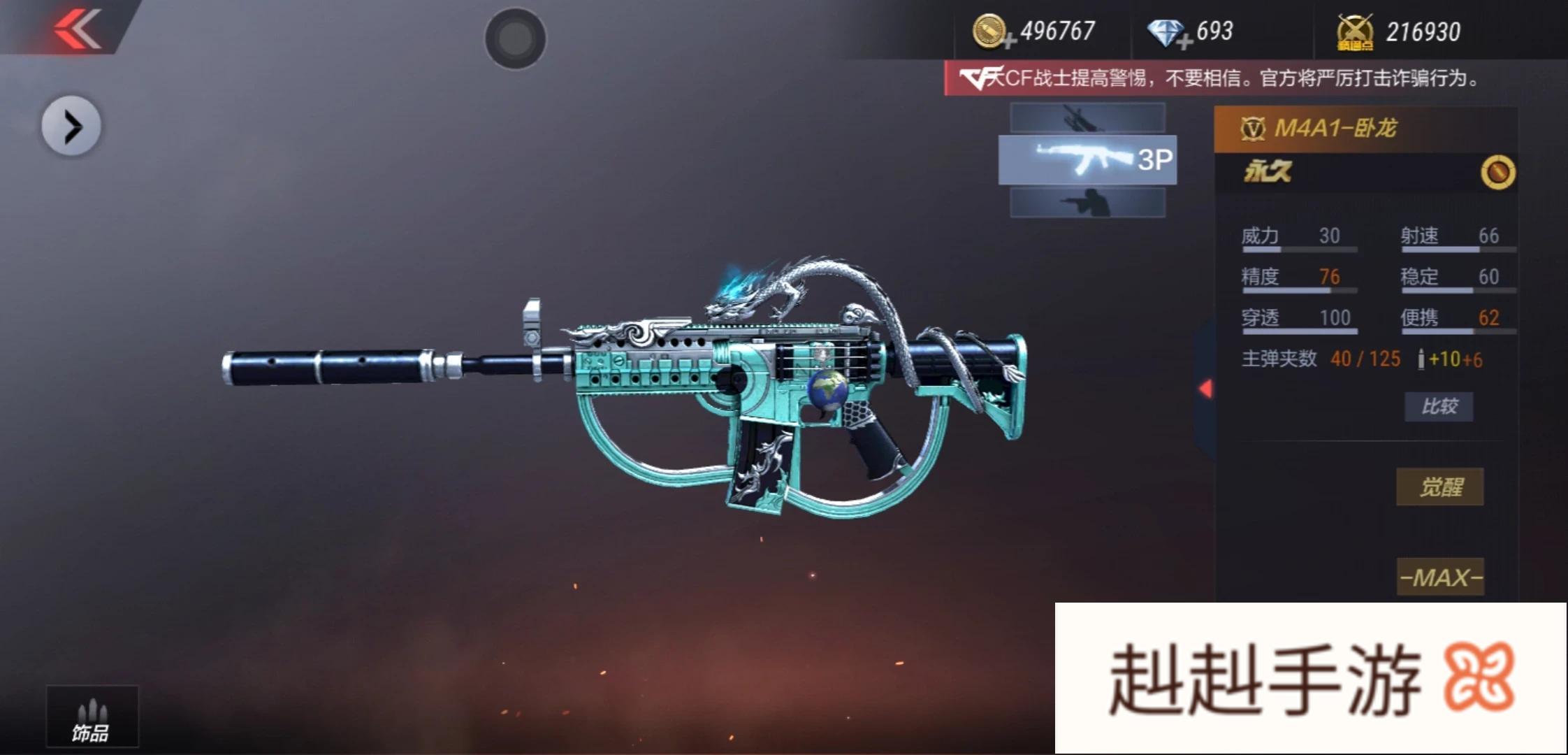 整体性能大幅度提升,专属金龙争霸战场。卧龙和卧龙觉醒是继电音之第二把切枪有电吉他音效的枪械,外观称得上是酷炫,整体手感也是不错。不过,在宇子看来,随着等级的慢慢提高,也明白了切枪声音越大暴露位置的可能性也是越大, 毕竟cf作为一款听声辨位的游戏,耳朵就是第二眼睛,暴露的可能性越大死的可能性越大。另外,随着初期的使用,官方对于卧龙也是做出了调整,新鲜感过去后,卧龙的使用者也是几乎不可见。