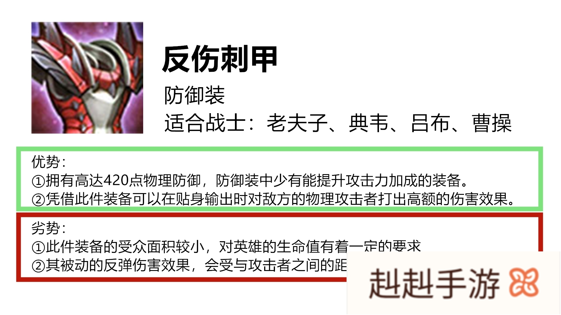 至于反伤刺甲,并非所有的战士都适合这件装备!在选择此件装备的情况下,使用者要么是最大生命值比较占优势,要么是自身拥有强势的续航能力!例如典韦、曹操等拥有强势回血能力的战士,其在选择反伤刺甲的情况下,不仅可以提升自身的攻击属性还能有效地保证安全血量值。