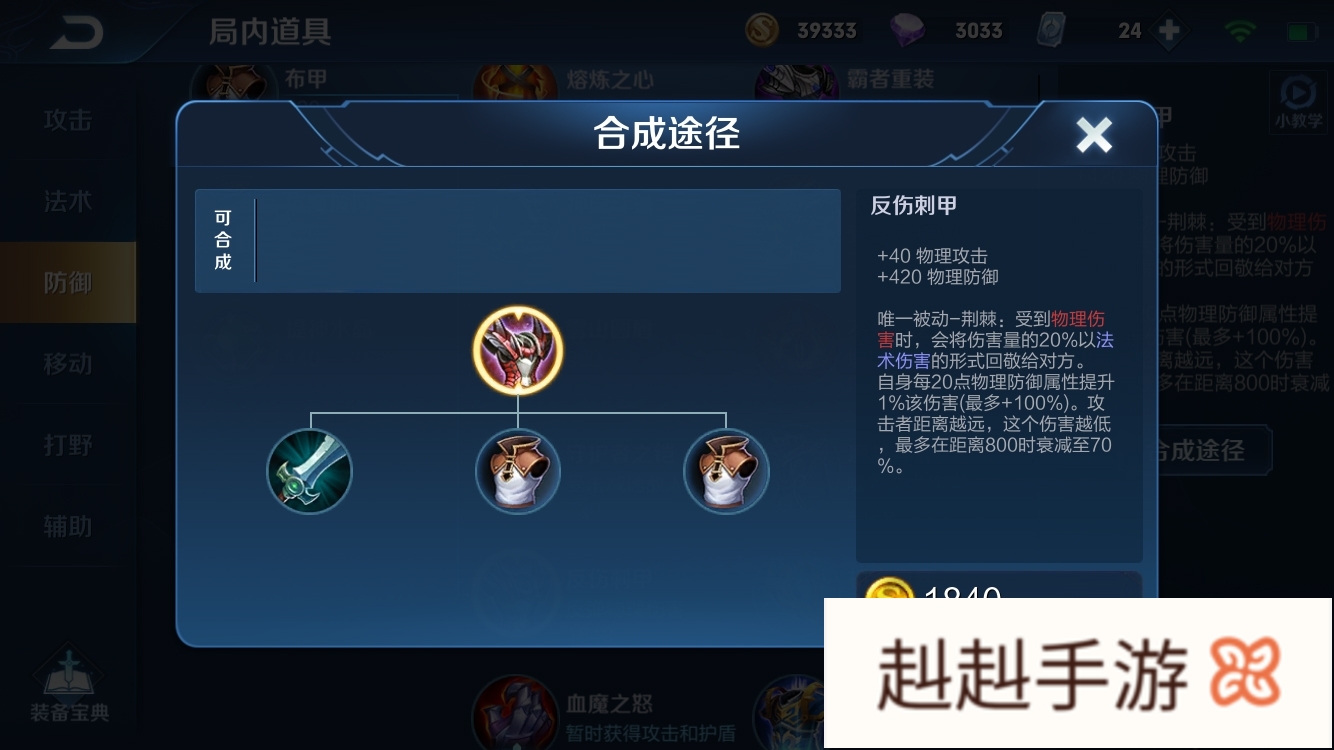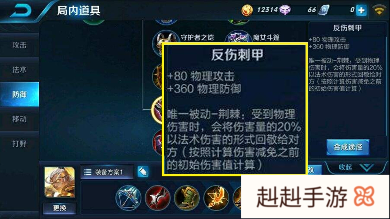 ⑴反伤刺甲是一件基础属性中附带有攻击力加成的防御装备,这是其在所有物理防御装备的中的优势之处。
