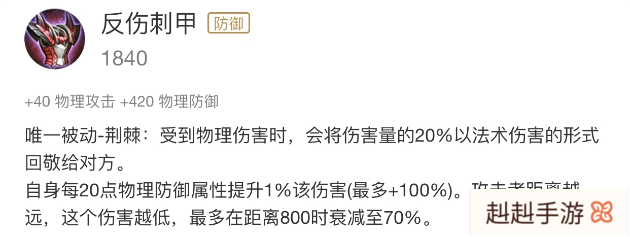 除此之外,反伤刺甲提供了高达420点的物理防御,可以在中期阶段大幅度的提升使用者的物理防御能力,而通过此件装备的被动,还能直接地反弹对手的物理伤害,并能将使用者的物理防御直接转换为伤害加成!