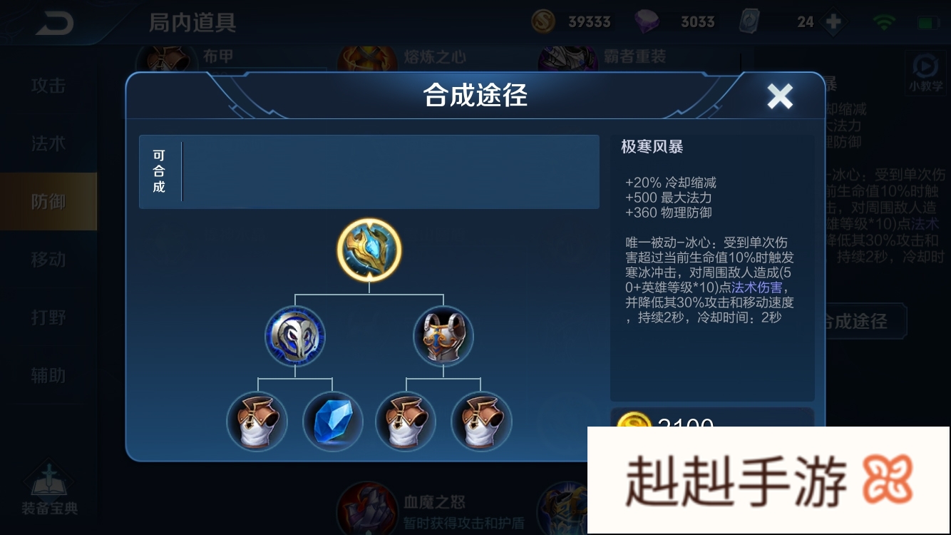 ⑵极寒风暴是一件战坦英雄即为重要的前期核心装,其主要的贡献效果在于提升使用者的基础防御,并间接的强化使用者的前期输出效果。